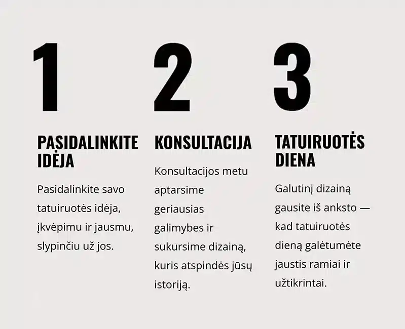 Konsultacija yra apgalvotos tatuiruotės pagrindas. Jos metu suderiname viziją su kūno anatomija, patiksliname koncepciją ir kuriame dizainą, kuris natūraliai dera su jūsų kūnu.